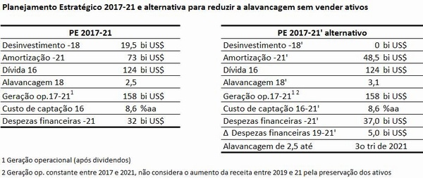 Na alternativa estudada a partir de parâmetros públicos da Petrobrás, sem vender um único ativo, a alavancagem poderia cair de 4,5 para 3,1 em 2018, indicador inteiramente razoável. A amortização anual da dívida, com recursos de parte da geração de caixa, resultaria na redução da alavancagem para 2,5 em meados de 2021. O estudo é conservador na medida em que não contabiliza a geração de caixa adicional pela preservação dos ativos rentáveis que se pretende vender até 2018.