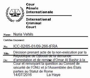 Conformément à l'article 17-3 de l'Accord régissant les relations entre l'Organisation des Nations Unies et la Cour pénale internationale, et ainsi que le prévoient l'article 87-7 du Statut de Rome et la norme 109-4 du Règlement de la Cour, je vous transmets par la présente, sur la demande de la Chambre préliminaire II, la « Decision on the non-compliance by the Republic of Djibouti with the request to arrest and surrender Oman Al-Bashir to the Court and referring the matter to the United Nations Security Council and the Assembly of the State Parties to the Rome Statute », rendue par ladite chambre le 11 juillet 2016 dans l'affaire Le Procureur c. Omar Hassan Ahmad Al Bashir.